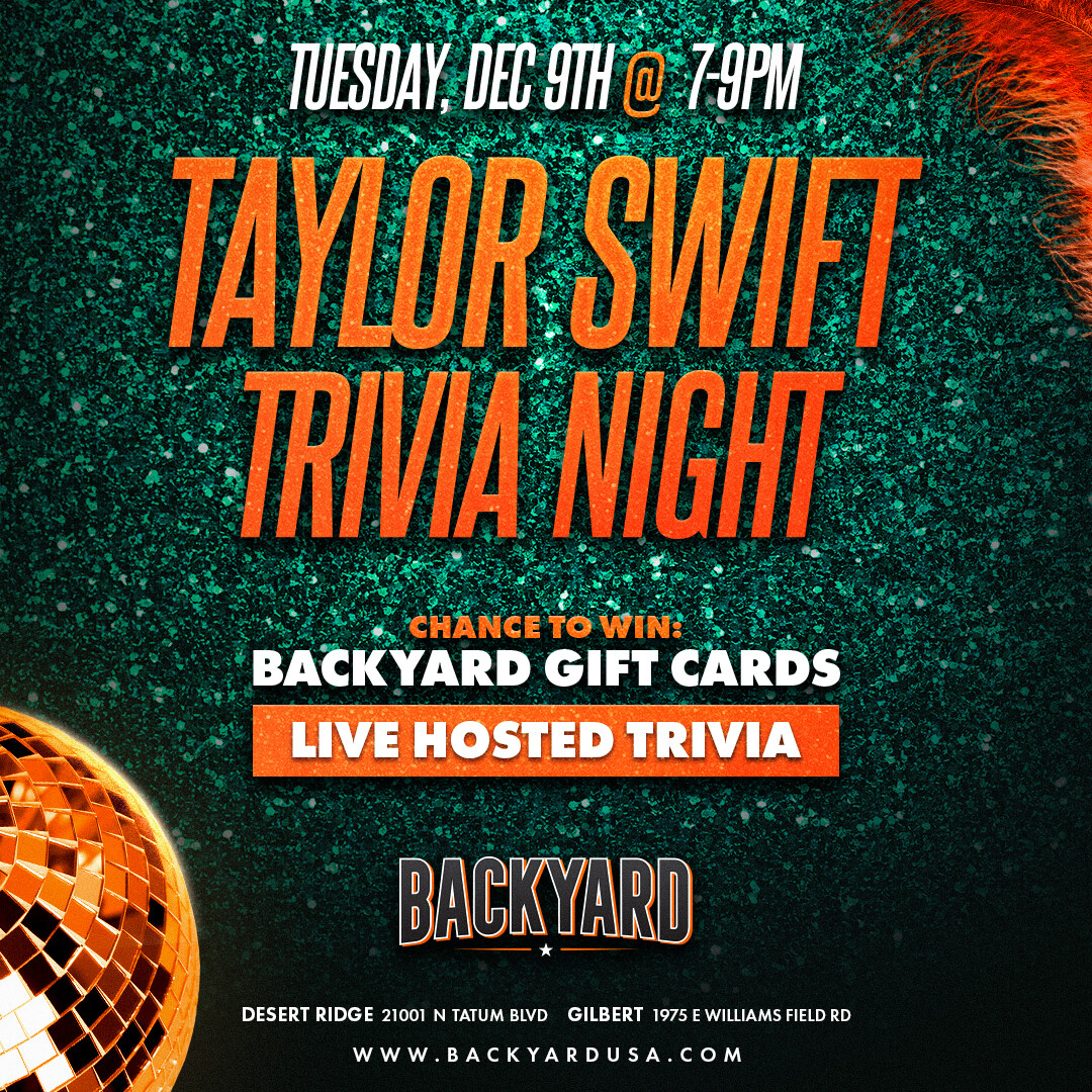 Calling all Swifties! Join us at Backyard Tuesday, December 9th from 7 PM to 9 PM for Taylor Swift Trivia Night. Test your knowledge of Taylor's hits and eras for a chance to win gift cards to Backyard. Bring your friends, show your Swiftie pride, and let's see who's the ultimate Taylor fan!